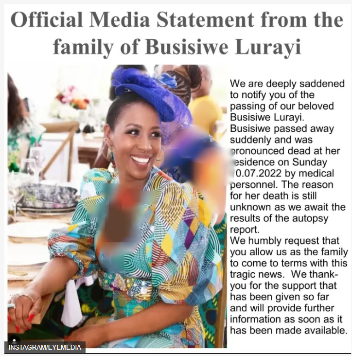 “Me pikëllim të thellë ju njoftojmë për ndarjen nga jeta të të dashurës sonë Busisiëe Lurayi”, thuhet në postim.