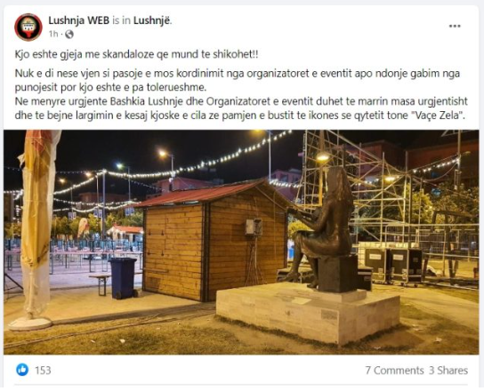 Ne menyre urgjente Bashkia Lushnje dhe Organizatoret e eventit duhet te marrin masa urgjentisht dhe te bejne largimin e kesaj kjoske e cila ze pamjen e bustit te ikones se qytetit tone “Vaçe Zela”-, thuhet në reagim.