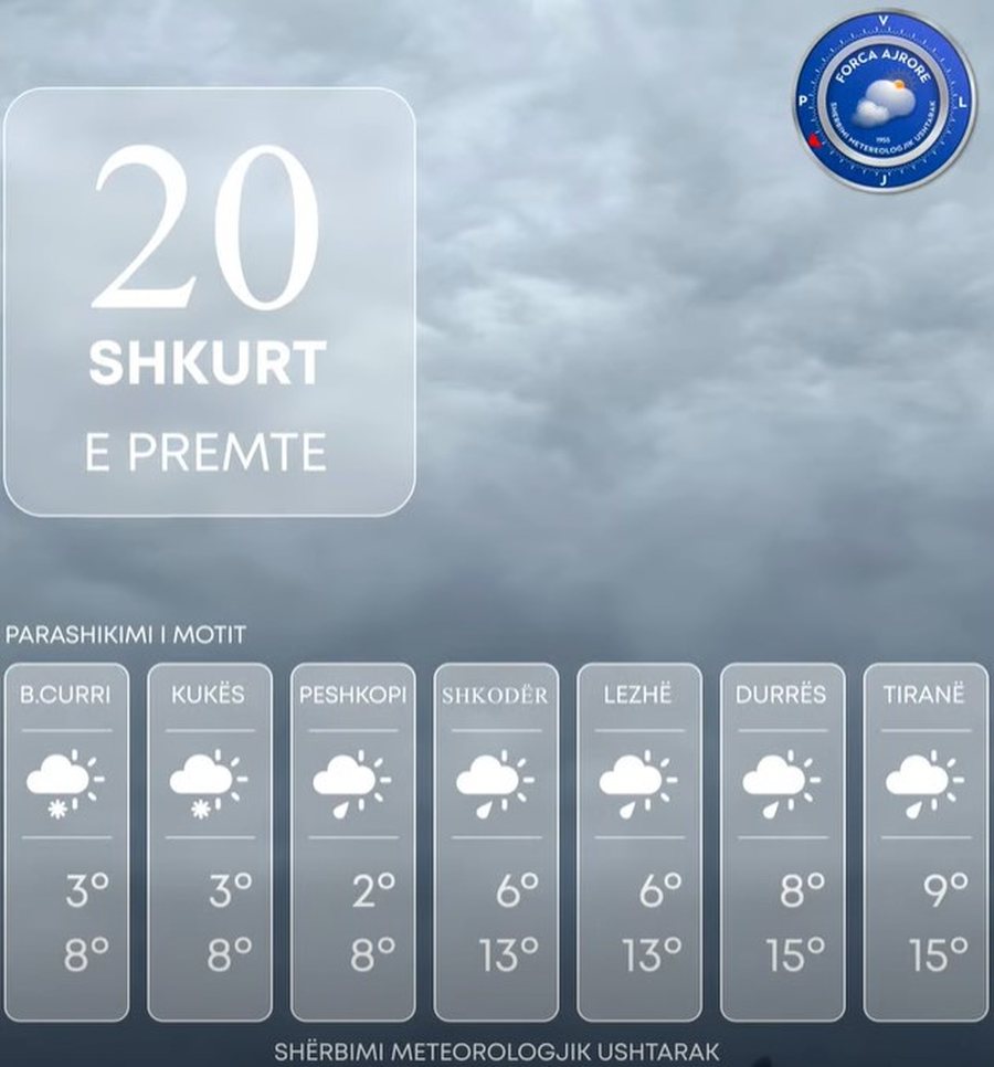 Pas orëve të mëngjesit reshjet e shiut parashikohet të vijojnë me intensitet të ulët në pjesën më të madhe të territorit, lokalisht shtrëngata afatshkurtra. Në zonën e Alpeve, verilindje –juglindje mbi 800-900 metër reshje dëbore me intensitet të ulët e lokalisht mesatar.
