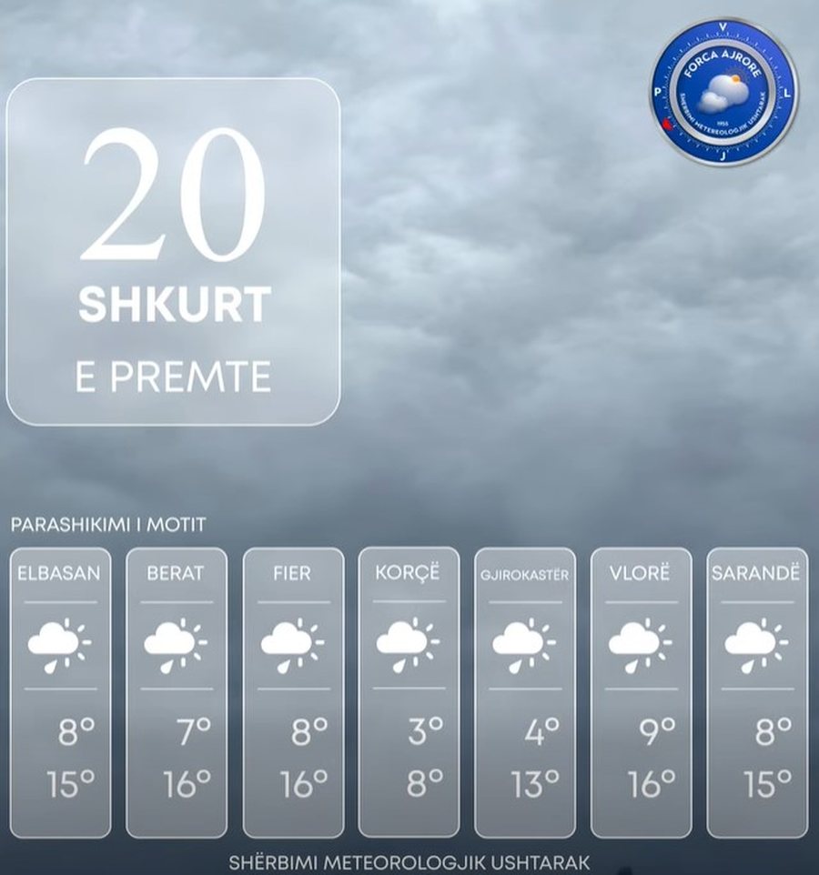 Reshjet e shiut parashikohen të jenë prezente që në orët e para të 24-orëshit fillimisht në veri e jug të vendit e gradualisht në të gjithë territorin, me intensitet të ulët e lokalisht mesatar.
