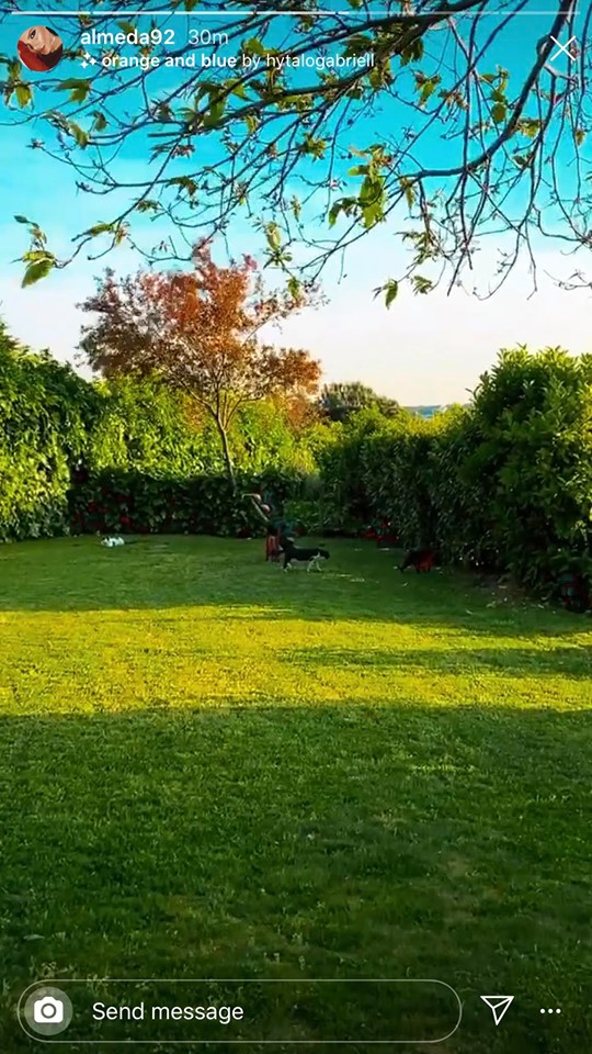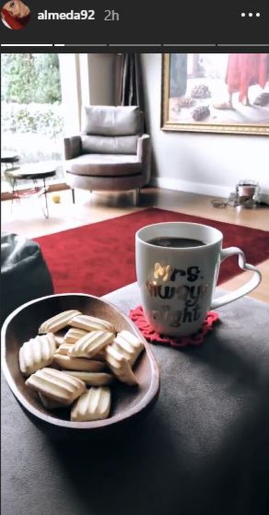 Almeda gjithashtu ka fotografuar nje kend te dhomes se ndenjes. Ne foton e publikuar ne ‘Instastory’ shohim pikturen e madhe ne mur, nje faqe te murit me xham i cili i jep me shume drite dhomes dhe kolltuqet ngjyre gri.