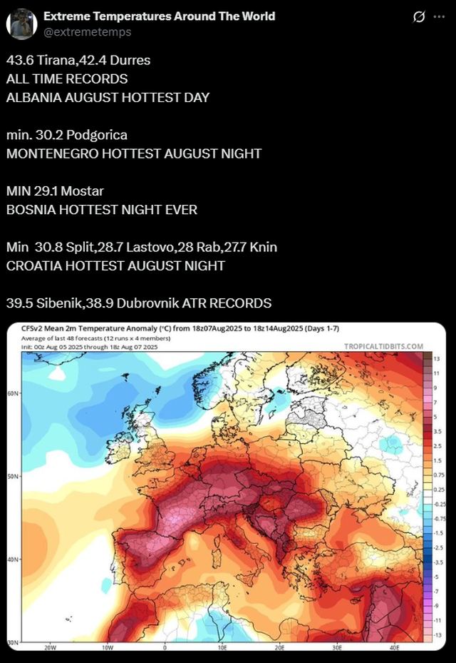 Shqipëria sapo ka përjetuar një nga ngjarjet më ekstreme të nxehtësisë së gushtit në historinë e saj të regjistruar, me temperatura që arritën nivele të papara. Të martën, Tirana regjistroi një rekord të ri të gushtit prej +43.6°C.. Jo shumë larg, qyteti bregdetar i Durresit arriti +42.4°C, një matje jashtëzakonisht e lartë për një vendndodhje detare, raporton “MKWeather”.